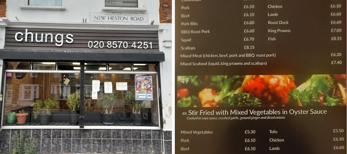 Welcome to Chung's Chinese, your go-to destination for authentic Chinese cuisine in Heston, Hounslow. Our menu features a delightful array of dishes, from classic chicken chow mein to crispy pork noodles, all crafted with care and bursting with flavor. We pride ourselves on offering a casual dining atmosphere perfect for dinner, alongside flexible service options including delivery and takeaway. Enjoy generous portions and vegetarian choices, ensuring there's something for everyone. With wheelchair-accessible seating and a warmly welcoming environment, we aim to provide a safe space for all. Come and experience the taste of tradition at Chung's Chinese!Food quality consistently receives praise; dishes evoke nostalgic feelings while delivering fresh tastes and generous portions.
